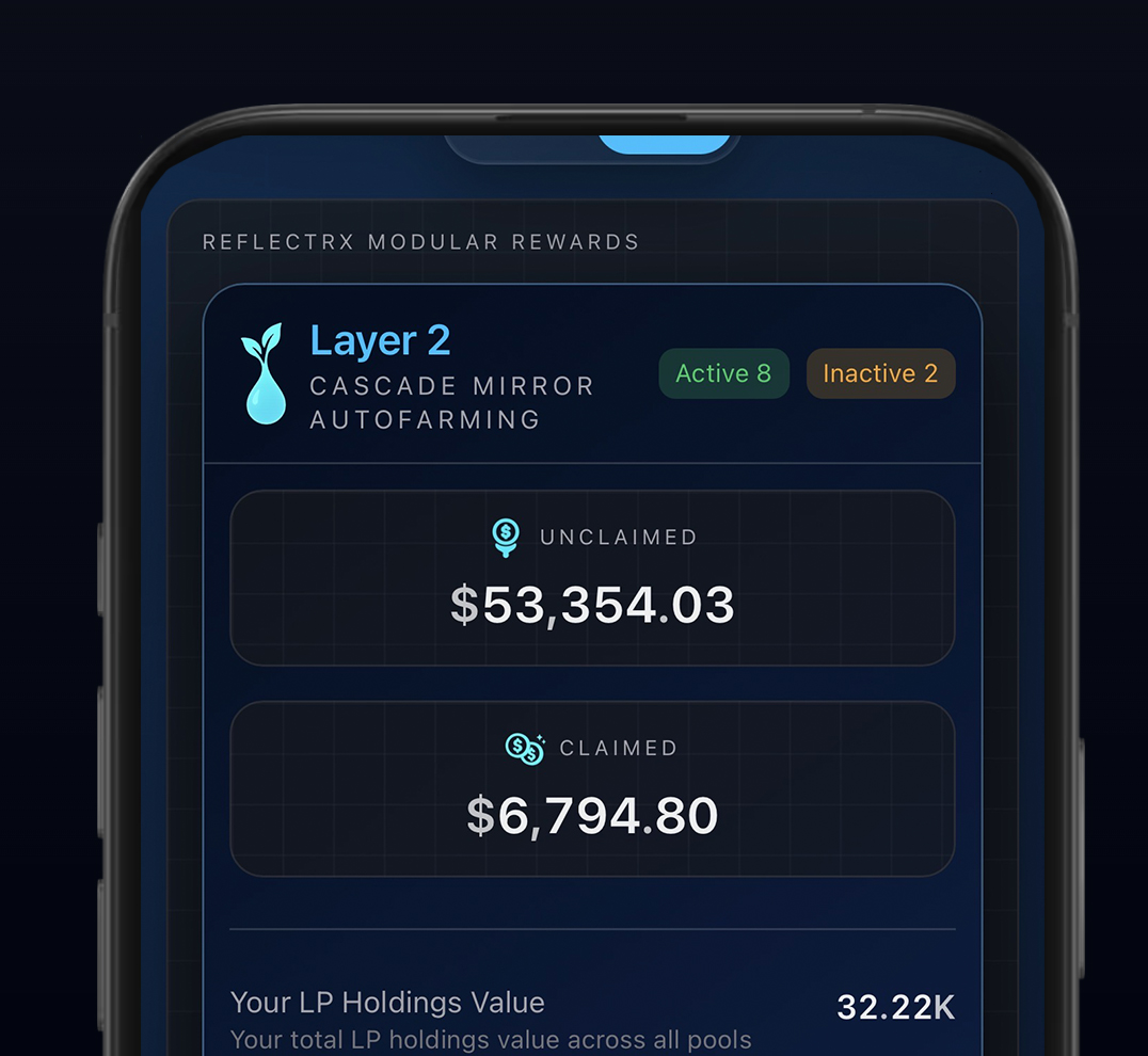 RTRx gives you full visibility over both sides of the ETF system — your Reward ETF (L1) streams and your LP ETF (L2) performance. Watch your allocations, volume-powered yield, and LP earnings update live right on your wallet.