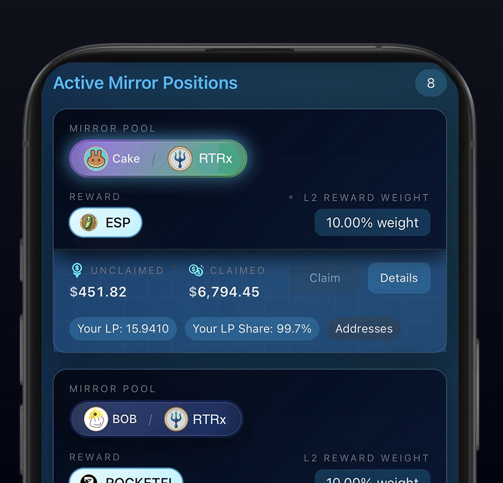 RTRx turns traditional liquidity providing into a self-custodied LP ETF.When you add liquidity to any RTRx pair, each position becomes a slice of a multi-pair liquidity.